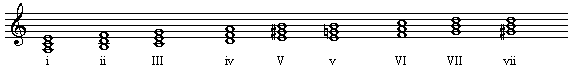 i级: 小三和弦、ii级:减三和弦、III级: 大三和弦、iv级:小三和弦、V级:大三和弦、