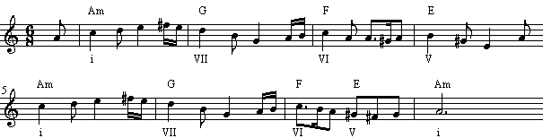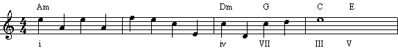 从上面的例子,我们看到,其中VII-III-VI三个和弦,与其说是a小调,不如说是C大调的V-I-IV更合适。这种