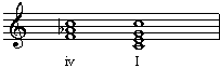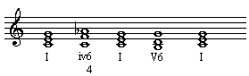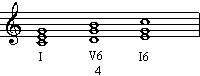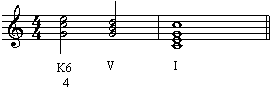 往往以属和弦结束),我们经常能看到属和弦(V级)前有一个强拍上的主四六和弦,这个和弦称为“终止四六