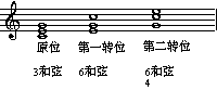 度,不再是和弦最低音时,我们称之为和弦的“转位”。三和弦总共有两个转位,被称为六和弦和四六和弦:
