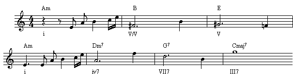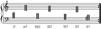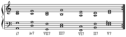 在第三节,我们提到过的模进:i-iv-VII-III-VI-ii-V-i,现在可以用七和弦代替三和弦: