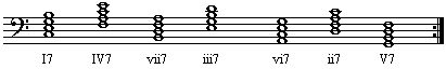 大调中,也可以作类似的模进:I7-IV7-vii7-iii7-vi7-ii7-V7-I7