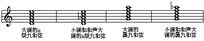 七和弦再向上叠置一个三度就是九和弦了,最常用的九和弦是大小调ii级的九和弦和属九和弦(V级九和弦)。