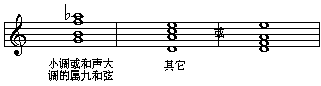 由于九和弦有五个音,把九和弦写成四部和声时需要省略一个音,小调或和声大调的属九和弦通常省略五音,