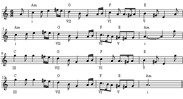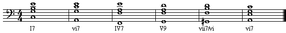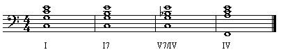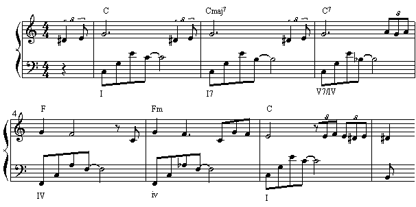 这样,我们就得到了一个“下属的属七和弦”─V/IV,这个和弦是借用下属调(上例中是F大调)中的属七和弦,临时离调向下属调。