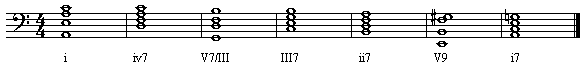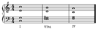 如果我们在这个进行:I-I7-IV的I7和IV之间,为了声部流畅,加一个“降低半音的I7和弦”。