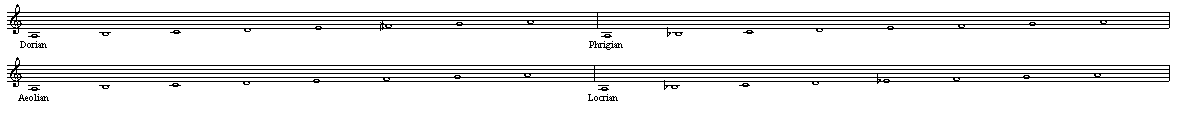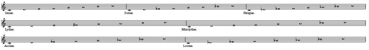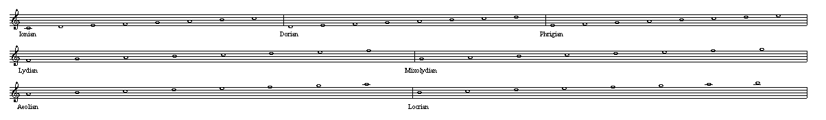 七种调式分别为:伊奥尼亚(Ionian)、多利亚(Dorian)、弗里吉亚(Phrygian)、利地亚(Lydian)、混合利地亚 (Mixolydian)、爱奥利亚(Aeolian)和络克里亚(Locrian)。(七种调式的名称各种翻译材料会有所不同,如果有 异议,均以这段中的中文和拉丁文对照为准。)这种体系也称为“调式体系”,区别于我们现在用的“大小调体 系”。我们现在的大小调体系是从这七种调式中的伊奥尼亚和爱奥利亚两种演变而来的,其它调式后来逐渐较 少使用。
