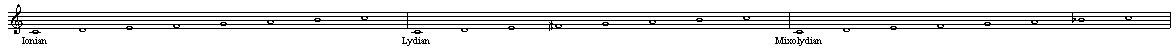 下面是以C为伊奥尼亚调式,所有调都采用同样的调号的排列方式。