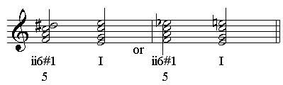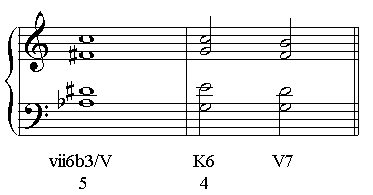 上面这种进行常常由重属导到主四六和弦代替,然后再到属和弦,这种进行声部更加自然。然而,这时重属导