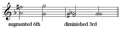 我们注意到这些和弦都有一个共同之处,就是有一个“增六度”,在理论上增六度和小七度是完全不同的,曾