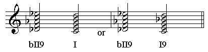降II级上的九和弦,这种和弦恐怕是前面所说的降3音的导和弦变化而来的,它在爵士乐中比较常用。此外,很
