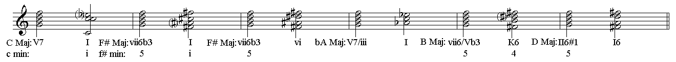 上述这些进行,我们从中发现一个规律,利用等音改写的方法,绝大多数都可以改写为大小七和弦,这就为我