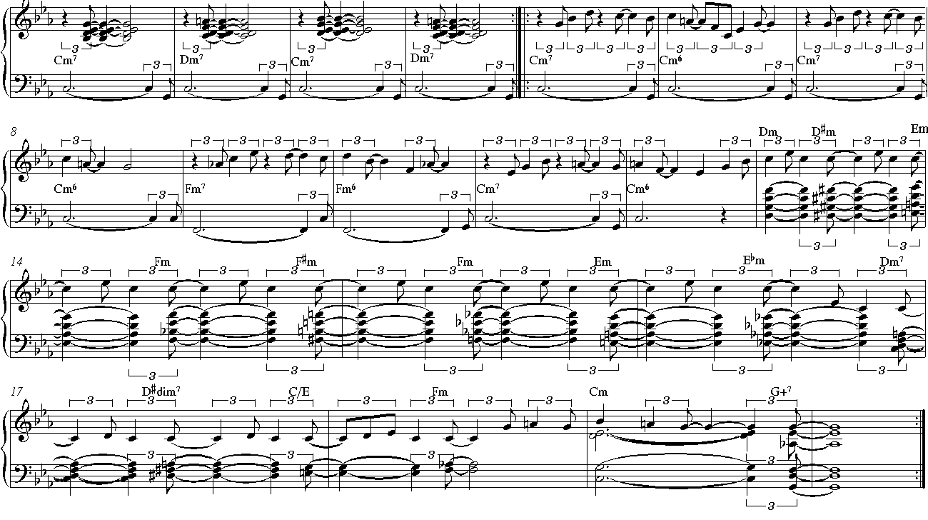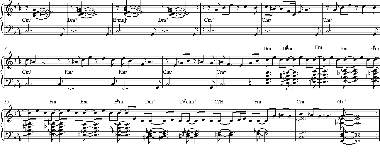 在本章中,我不仅将介绍一些在爵士乐中常见的和声现象,也同时简单地介绍一些爵士乐的编配,如bass、鼓